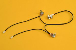 Los potenciómetros van conectados en la mitad del recorrido del cable. Recordemos que un potenciómetro tiene terminales. El primero de izquierda a derecha, mirando el potenciómetro de frente es tierra. El segundo o pin central es la salida y el tercer pin o pin derecho es la entrada.